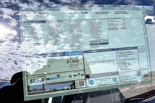 HEATED SEATS, NAVIGATION, MULTI-ZONE CLIMATE CONTROL, POWER LOCKS, POWER WINDOWS, PREMIUM AUDIO, PREMIUM WHEELS, SECURITY SYSTEM, 360 CAMERA, ADAPTIVE CRUISE CONTROL, ADAPTIVE HEADLIGHTS, ANDROID AUTO / APPLE CARPLAY, AUTOMATIC HEADLIGHTS, BLIND-SPOT MONITORS, COLLISION AVOIDANCE SYSTEM, COLLISION WARNING ALERT SYSTEM, KEYLESS ACCESS w/PUSH BUTTON START, LANE KEEPING ASSIST, SMARTPHONE APP INTEGRATION, TOUCHSCREEN CONTROLS, VOICE RECOGNITION, WI-FI HOTSPOT, Terrain AT4, 4D Sport Utility, 1.5L DOHC, 8-Speed Automatic with Overdrive, AWD, Sterling Metallic, Forest Storm W/Mahogany Accents Cloth, 2-Way Power Driver Lumbar Seat Adjuster, 3.47 Final Drive Axle Ratio, 4-Wheel Disc Brakes, 6 Speakers, 6-Speaker Audio System Feature, 8-Way Power Driver Seat Adjuster, ABS brakes, Air Conditioning, Alloy wheels, AM/FM radio: SiriusXM, Auto High-beam Headlights, Automatic temperature control, Brake assist, Bumpers: body-color, Cloth/Core Tec Seat Trim, Compass, Delay-off headlights, Driver and Front Passenger Heated Seats, Driver door bin, Driver vanity mirror, Dual front impact airbags, Dual front side impact airbags, Electronic Stability Control, Emergency communication system: OnStar and GMC connected services capable, Four wheel independent suspension, Front anti-roll bar, Front Bucket Seats, Front Center Armrest, Front dual zone A/C, Front fog lights, Front Passenger 4-Way Manual Seat Adjuster, Front reading lights, Fully automatic headlights, Garage door transmitter, Heated door mirrors, Heated front seats, Heated steering wheel, Illuminated entry, License Plate Front Mounting Package, Low tire pressure warning, Navigation System, Occupant sensing airbag, Outside temperature display, Overhead airbag, Overhead console, Panic alarm, Passenger door bin, Passenger vanity mirror, Power door mirrors, Power driver seat, Power Liftgate, Power steering, Power windows, Preferred Equipment Group 4SB, Radio data system, Radio: Premium GMC Infotainment System, Rain sensing wipers, Rear air conditioning, Rear anti-roll bar, Rear seat center armrest, Rear window defroster, Rear window wiper, Remote keyless entry, Security system, SiriusXM with 360L Trial Subscription, Speed control, Speed-sensing steering, Split folding rear seat, Spoiler, Sport steering wheel, Steering wheel mounted audio controls, Tachometer, Telescoping steering wheel, Tilt steering wheel, Traction control, Trip computer, Variably intermittent wipers, Wheels: 17 Dark Machined Aluminum, Wireless Apple CarPlay/Wireless Android Auto. 24/26 City/Highway MPG